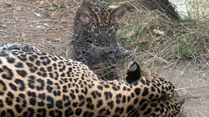 Леопардчето все още суче мляко от майката и комбинира с месо. Киара винаги оставя първо рожбата й да се нахрани и след това обира, каквото е останало от месото след нея.